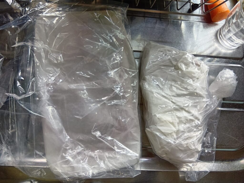 袋から取り出し、ラップもはがし、キッチンペーパーでしっかり水気をとってから、またキッチンペーパーに包んで冷蔵庫にいれて落ち着かせました。