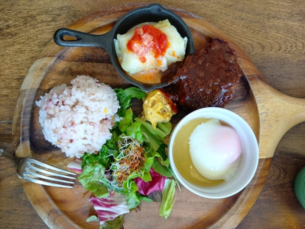 • ハニーのチョイス: グロワーズプレートA(ハンバーグ)。十六穀米にスープ・ドリンク付きで、バランスの良い一皿。