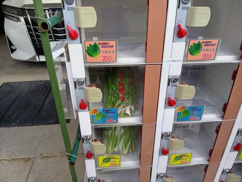 透明なコインロッカーの様なものが野菜の自動販売機です。