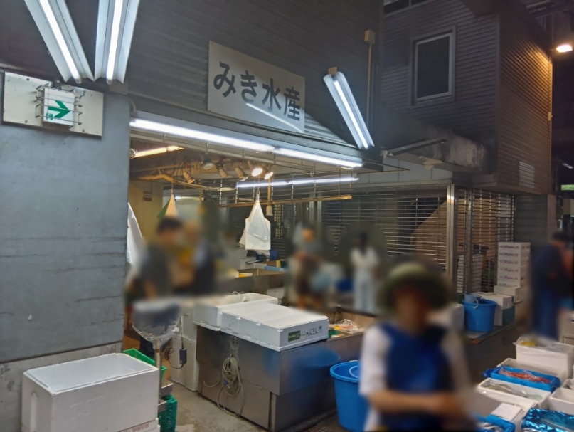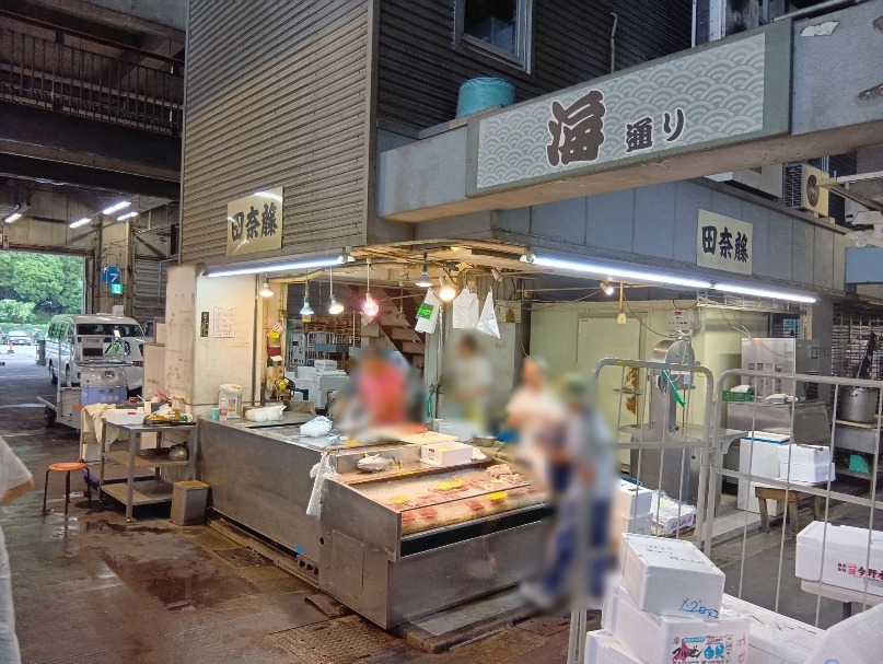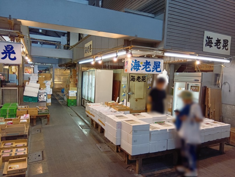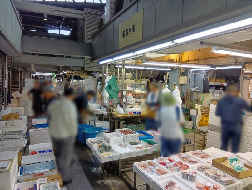 市場の車が走っていますので邪魔にならないように気を付けて奥に歩いて行くと水産の雰囲気が出てきます。