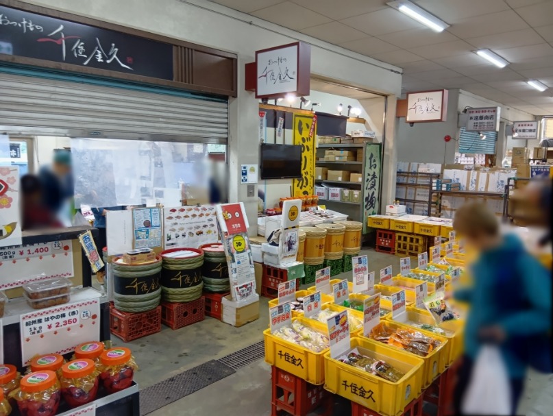 食堂街を抜けると、仲卸棟の前に並ぶのが物販棟です。まずはここで、ご飯のお供やちょっと珍しい食材をチェック!
