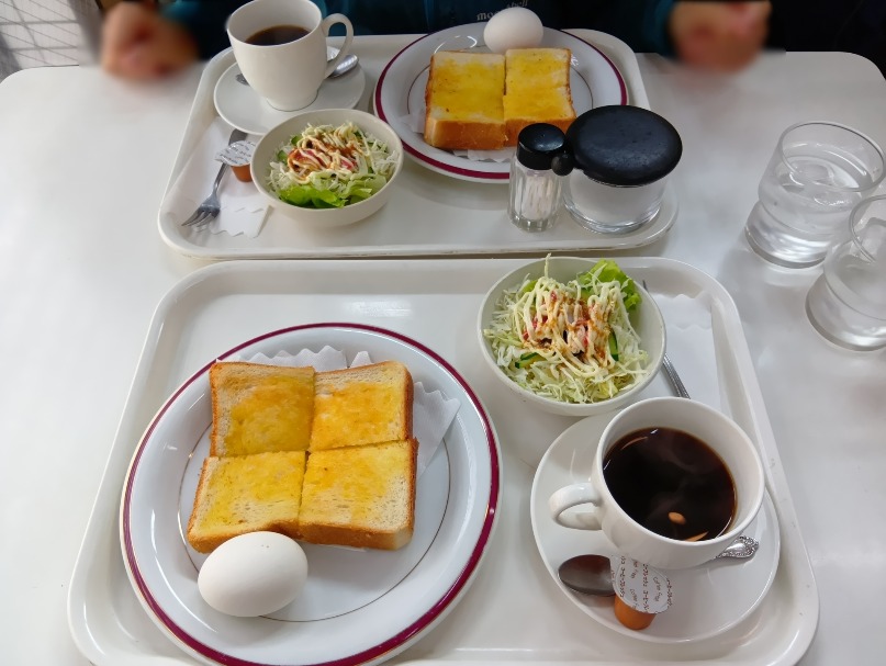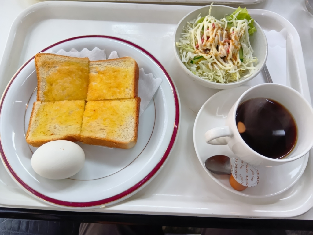 モーニングサービスのAセットを注文。トースト、ゆで卵、サラダ、コーヒーという王道のセットが、市場での興奮を優しく癒してくれます。