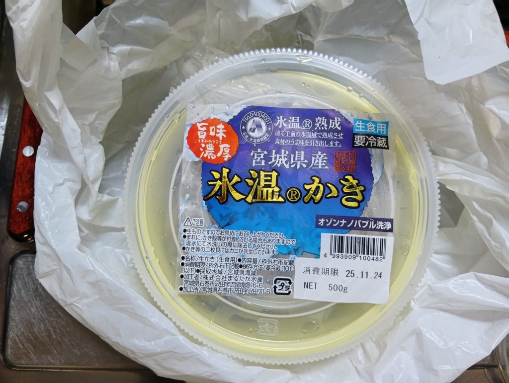 で、ホタテ、カキ、ボタン海老、イカ、(プラス白子)の船橋市場で買ってきました海鮮で作ったアヒージョです。