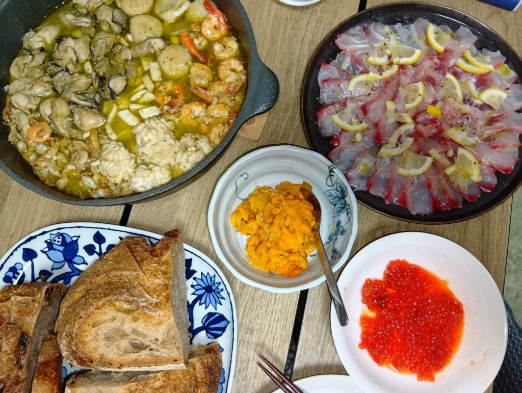 船橋市場で買って来た海鮮と武蔵五日市のCOMPAINで買って来たカンパーニュでとっても美味しいアヒージョを作りました。