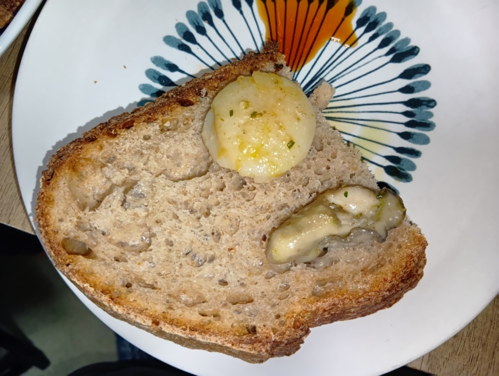 コンパン(カンパーニュ)に海鮮アヒージョの具を乗せて食べ、ニンマリ。