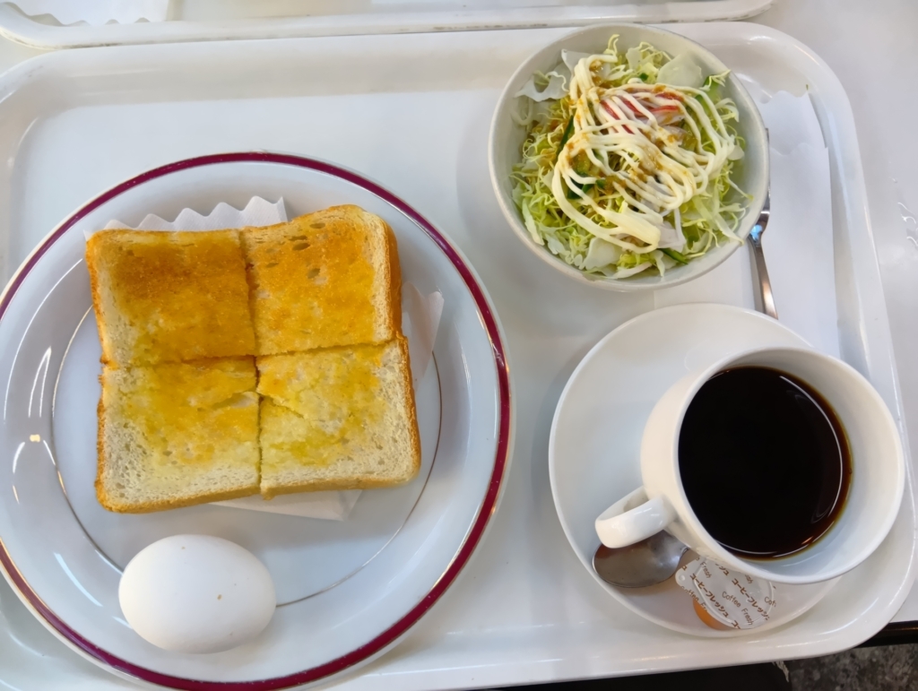 トーストにサラダにゆで卵の王道モーニングです。