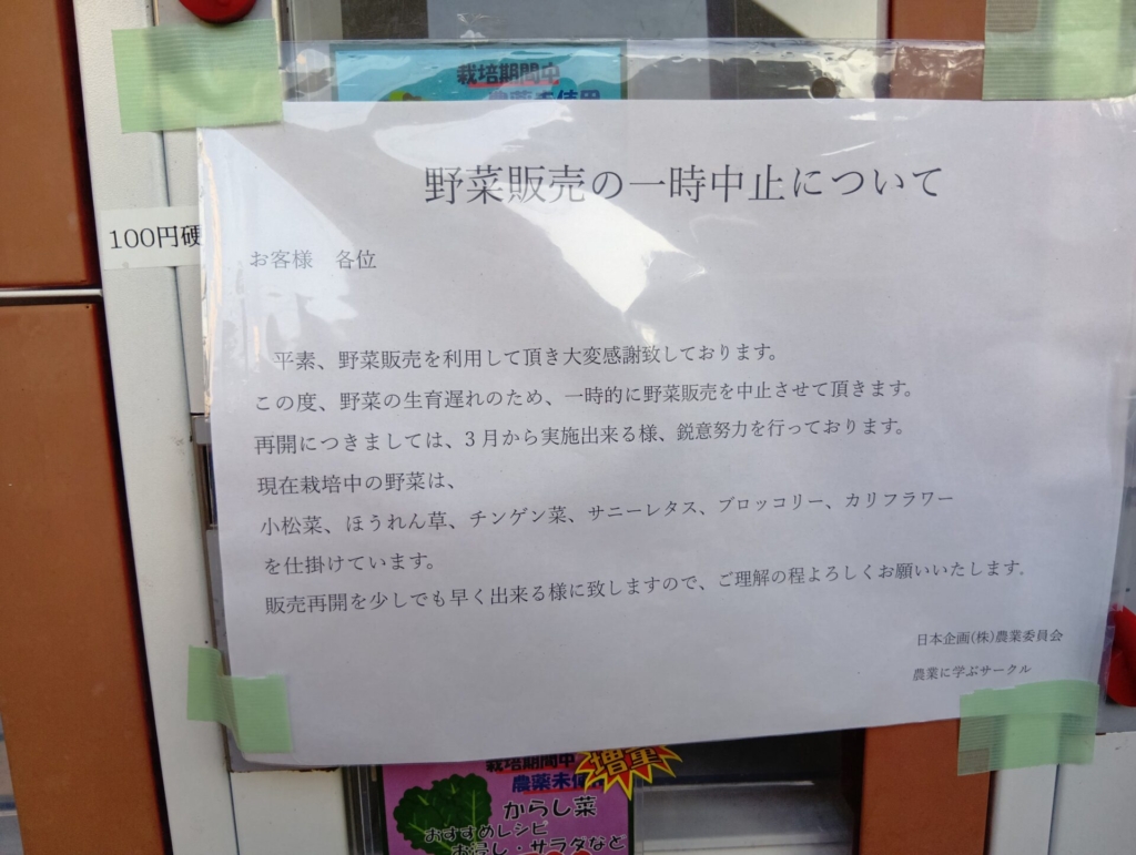 お目当ての一つだった野菜の自販機には、「3月までお休み」の張り紙が……。残念ですが、春の再開を楽しみに待ちましょう。