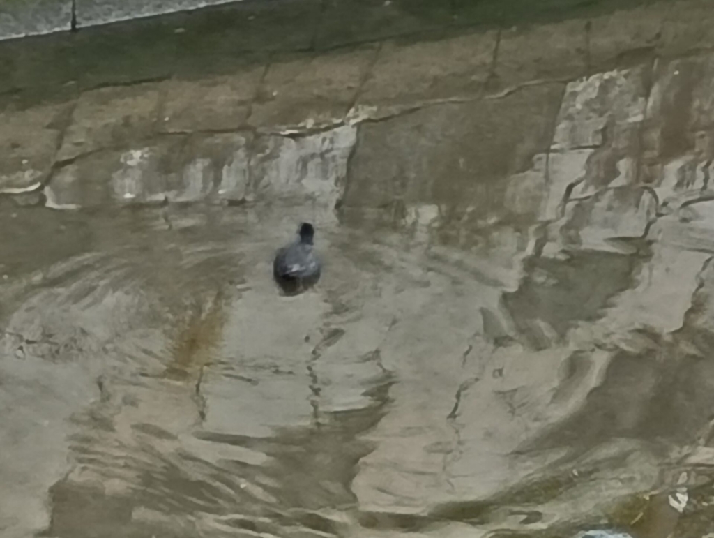 川面にはオオバンがぷかぷかと。市場の喧騒とは対照的な、穏やかな船橋の日常風景です。