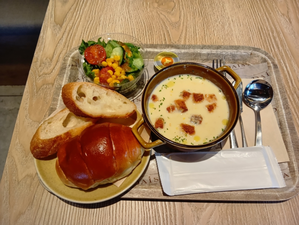 それだけでなく、フードメニューも驚くほど充実しているので、しっかり食べたい彼も、軽く済ませたい彼女も、それぞれお気に入りを見つけることができるはずです。今回いただいたのは、心まで温まるコーンポタージュのスーププレート。