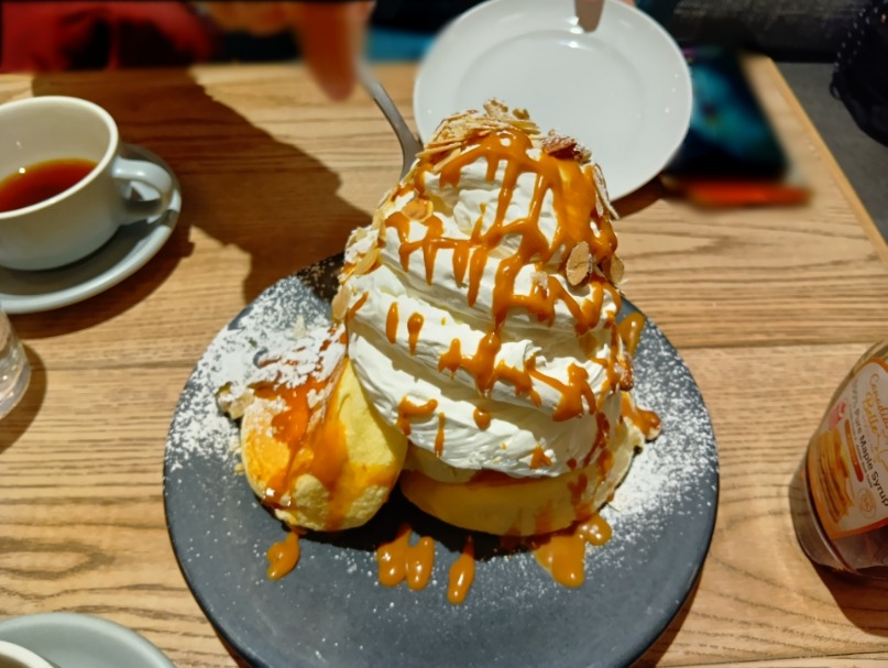 パンケーキの上には、これでもかというほどたっぷりのクリームが乗っています。あまりの高さに、クリームが今にも倒れそうになってしまい、思わず二人で慌ててスプーンで支える一幕もあるかもしれません。そんなハプニングも、後になれば楽しい思い出話になりますね。クリームは見た目のインパクトに反して甘さが控えめで、とても軽いテイストなので、驚くほどあっという間に平らげてしまいます。