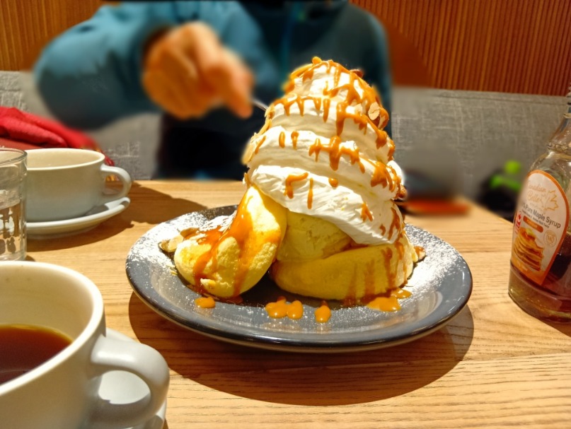 ここで注文してほしいのが、名物のふわふわパンケーキです。運ばれてきた瞬間、そのボリュームにきっと驚くはずです。