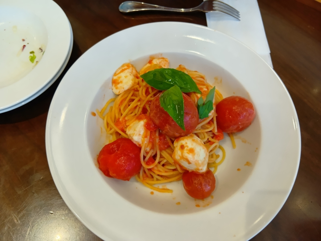 トマトとモツァレラチーズのパスタ:王道ながらも濃厚なトマトソースがたまらない!