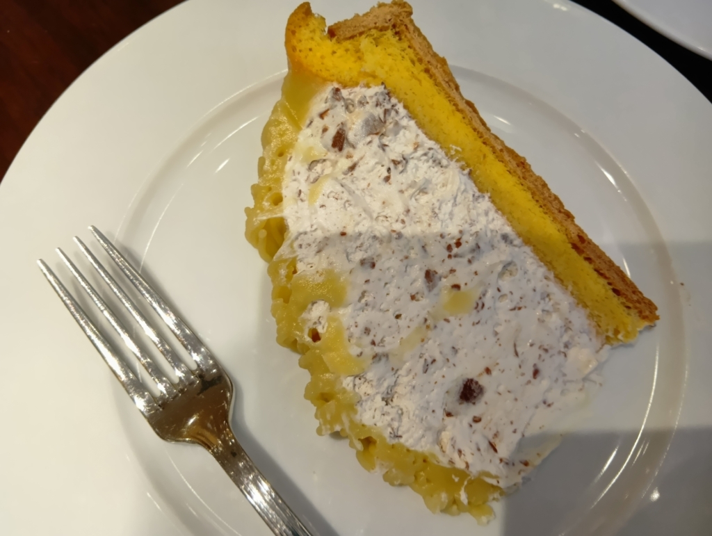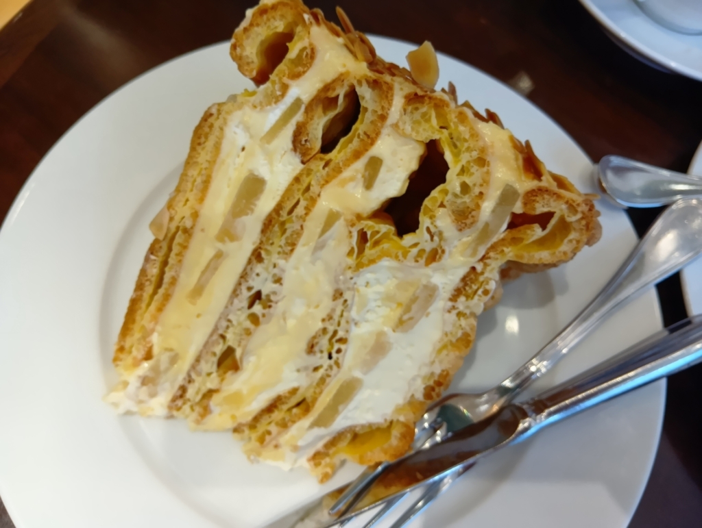 さらに、今回はどうしても食べたかった「洋ナシのミルフィーユ」を追加オーダー!これはランチサービスでは選べない季節限定のケーキなんです!サクサクのパイ生地と瑞々しい洋ナシの組み合わせが最高でした。
