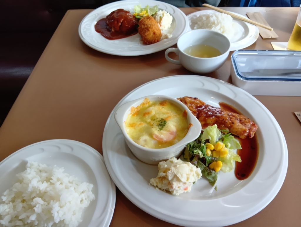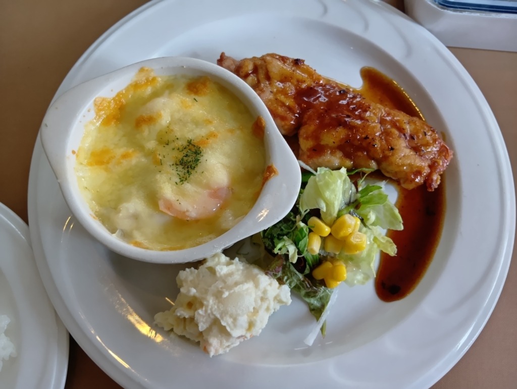 香ばしいチキンソテーと、熱々のエビグラタン。王道の組み合わせ。