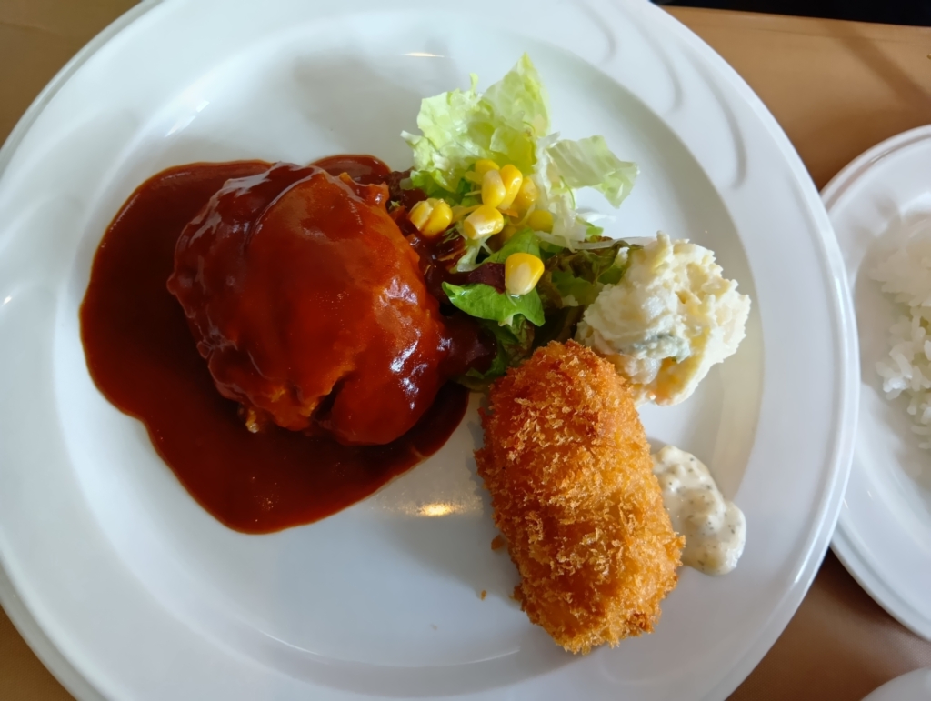 とろとろのクリームコロッケと、肉汁あふれるハンバーグ。デミグラスソースが絶品! 美味しい料理に舌鼓を打ち、最後はコーヒーでほっと一息。