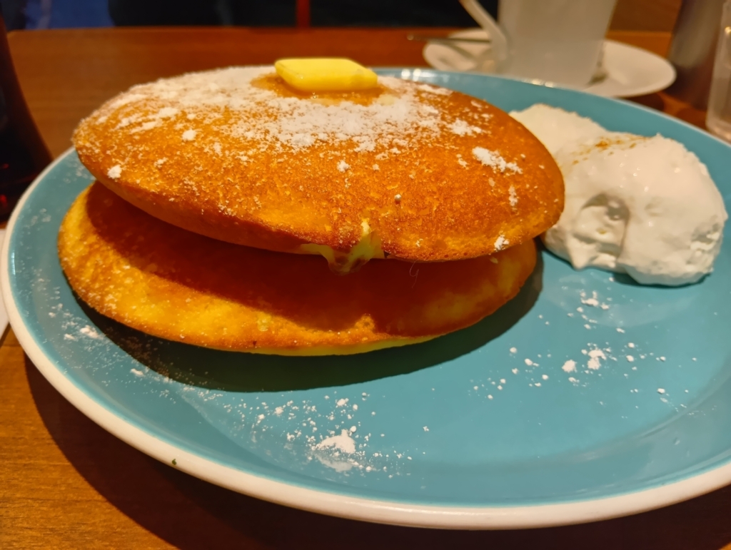 そして、今回のお目当て、デンマークチーズパンケーキの登場です。運ばれてきた瞬間、「大きい!」と思わず声が漏れるほどのボリューム。しかし、その見た目とは裏腹に、驚くほど軽やかなんです。