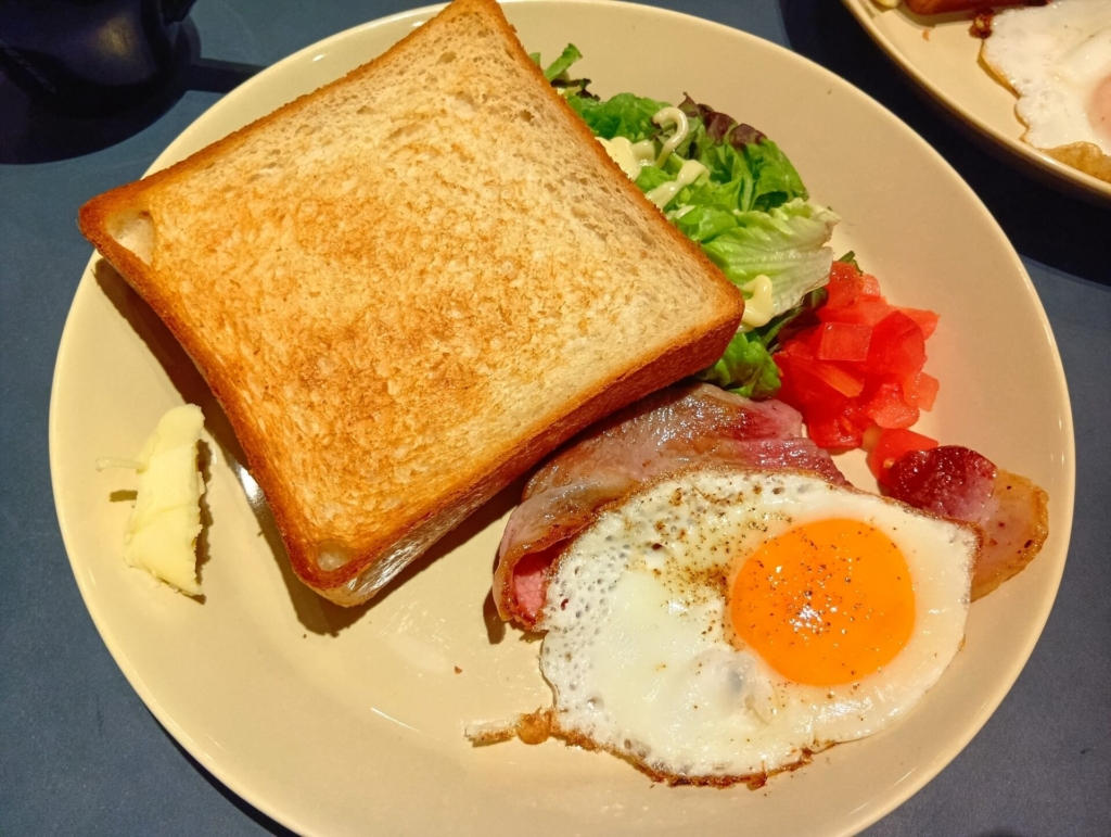 まずはトーストを一口。外側はカリッと小気味よい音を立て、中は驚くほどもっちりとしています。添えられたバターをたっぷり塗れば、小麦の甘みがさらに引き立ちます。そして、この一皿の主役ともいえるのが、完璧な焼き加減のサニーサイドアップ(目玉焼き)。